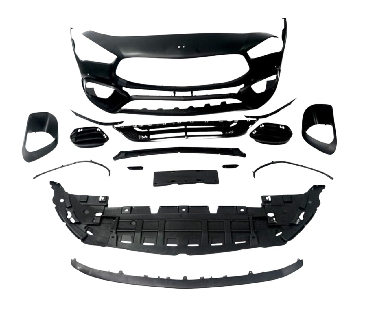 • Bară Față CLA 45 AMG Design: Fabricată din polipropilenă (PP) premium, pregătită pentru vopsire. Include grile centrale și laterale, suporturi pentru senzori de parcare (PDC), și capac pentru cârligul de remorcare.